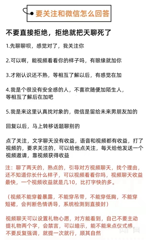 記者注意到,“使用手冊”第一頁聲明中稱,只參與軟件推廣,不涉及套路教學(xué)、虛假聊天、誘導(dǎo)充值。當(dāng)記者對是否能賺到錢表示擔(dān)憂時,該推廣員發(fā)來一份“社交聊天日入千元攻略”,包含怎樣設(shè)置頭像、如何引導(dǎo)對方視頻聊天、如何拒加微信等信息。