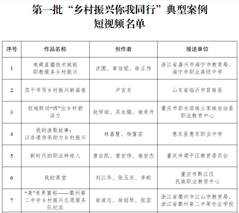 通知稱,根據(jù)《教育部辦公廳關(guān)于開展“鄉(xiāng)村振興你我同行”典型案例短視頻征集與宣傳活動的通知》(教職成廳函〔2023〕1號)要求,經(jīng)各地申報、網(wǎng)絡(luò)投票、專家評議、公示,現(xiàn)公布第一批“鄉(xiāng)村振興你我同行”典型案例短視頻名單。