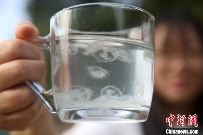 工作人員從水庫打撈出來的桃花水母?!√m自濤 攝