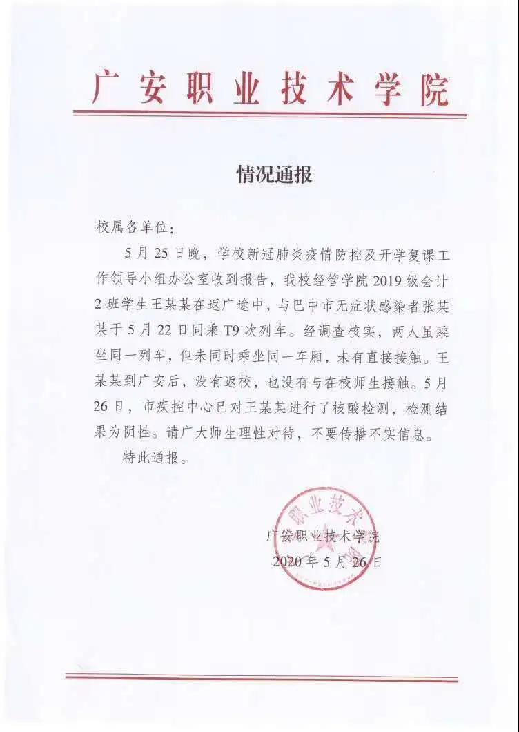 公告稱, 5月25日晚,廣安職業(yè)技術(shù)學院新冠肺炎疫情防控及開學復(fù)課工作領(lǐng)導(dǎo)小組辦公室收到報告,該校經(jīng)管學院2019級會計2班學生王某某在返廣(安)途中,與巴中市無癥狀感染者張某某于5月22日同乘T9次列車。經(jīng)調(diào)查核實,兩人雖乘坐同一列車,但未同時乘坐同一車廂,未有直接接觸。王某某到廣安后,沒有返校,也沒有與在校師生接觸。5月26日,廣安市疾控中心對王某某進行核酸檢測,檢測結(jié)果為陰性。