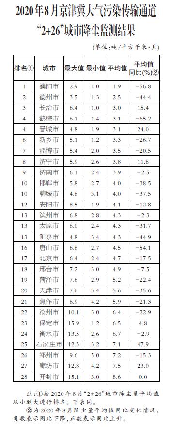 生態(tài)環(huán)境部公布8月京津冀大氣污染傳輸通道 “2+26”城市和汾渭平原11城市降塵監(jiān)測(cè)結(jié)果