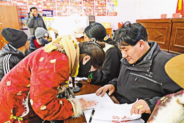 圖為圓夢新居社區(qū)群眾有序排隊、簽字、按手印,準備領取分紅。 記者 達珍 永青 攝