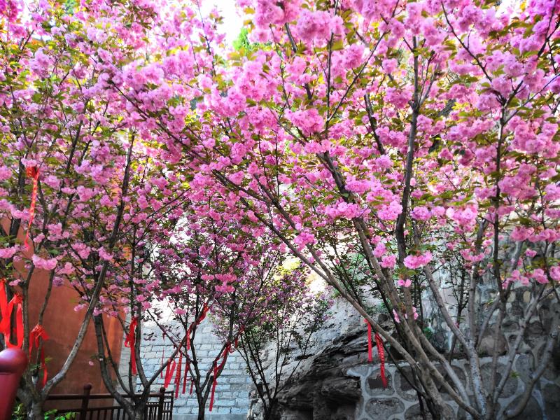 在玄中寺,墻角處十余株櫻花樹滿樹繁花,凋謝的櫻花飄落滿山坡,腳步踏在花片上,形成了一條條用花片鋪成的小道,人們邊走邊觀賞櫻花,也另有一番風(fēng)景?。▉碓矗航怀强h新聞辦 孫寶忠)