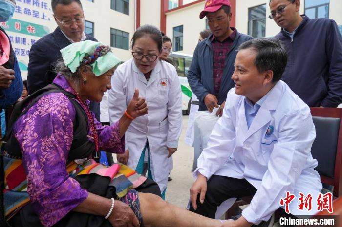 圖為青島醫(yī)療專家團(tuán)隊在日喀則為62歲的倉木拉老人進(jìn)行診斷,倉木拉對援藏醫(yī)療專家豎起大拇指。王建亮 攝