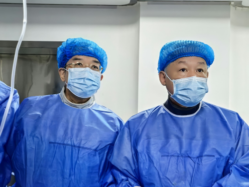 義診現(xiàn)場?。⊥鮽ッ窠淌谂c張大東教授為確診患者實施介入手術(shù)
