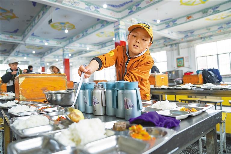 圖為那曲市班戈縣中石化小學(xué)學(xué)生在為同學(xué)們分發(fā)午餐(6月22日攝)。 新華社記者 丁增尼達 攝