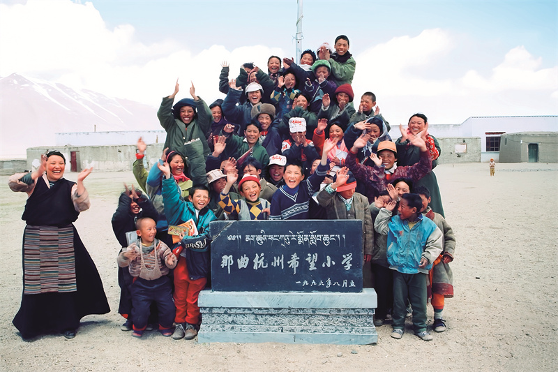 那曲杭州希望小學(xué)建成時(shí),老師和學(xué)生在石碑前合影留念。那曲市色尼區(qū)委宣傳部供圖