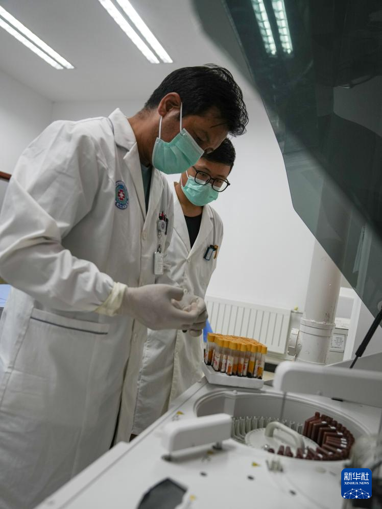 8月30日,林周縣強(qiáng)嘎鄉(xiāng)衛(wèi)生院醫(yī)生東智才讓使用生化分析儀檢測(cè)患者肝功能和腎功能狀況。新華社記者 晉美多吉 攝