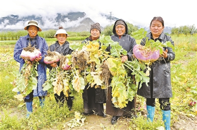 中國科學(xué)院創(chuàng)新研發(fā)的蕪菁種植技術(shù)為促進(jìn)當(dāng)?shù)剞r(nóng)業(yè)生產(chǎn)與畜牧業(yè)的發(fā)展提供了技術(shù)支撐。圖為拉薩市曲水縣才納鄉(xiāng)村民抱著蕪菁新品種。
