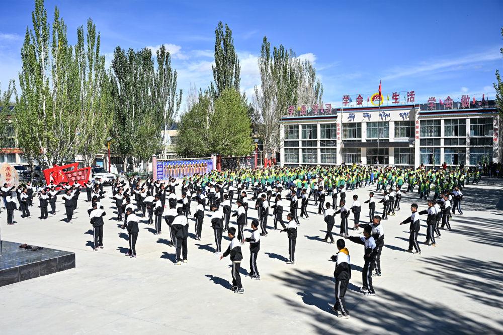 課間時(shí)分,孩子們跳起融入國(guó)家級(jí)非物質(zhì)文化遺產(chǎn)“宣舞”特色的課間操,各民族學(xué)生手拉著手,笑容如同高原陽(yáng)光般燦爛。