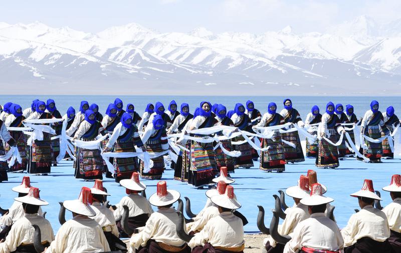 5月19日,在距拉薩市區(qū)240公里、海拔4718米的納木措湖邊,一場盛大的“開湖日”活動(dòng),將西藏“圣湖”納木措的美展現(xiàn)在國內(nèi)外約200名賓客眼前。圖為舞蹈演員在納木錯(cuò)開湖活動(dòng)現(xiàn)場表演。記者 旦增蘭澤 攝
