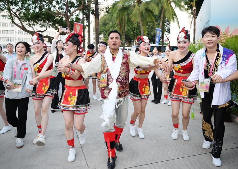 11月22日,由國家民委和國家體育總局主辦、海南省人民政府承辦的第十二屆全國少數(shù)民族傳統(tǒng)體育運(yùn)動(dòng)會(huì)在海南三亞開幕。圖為第十二屆全國少數(shù)民族傳統(tǒng)體育運(yùn)動(dòng)會(huì)西藏代表團(tuán)民族健身操運(yùn)動(dòng)員賽后與福建代表團(tuán)運(yùn)動(dòng)員一起跳鍋莊。