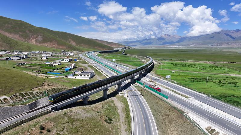 1954年12月25日川藏、青藏公路同時(shí)通車?yán)_,西藏日報(bào)聯(lián)合四川日報(bào)、青海日報(bào)開展的“大道向前 天路放歌——紀(jì)念‘兩路’建成通車70周年”聯(lián)合采訪。圖為記者在拉薩當(dāng)雄縣境內(nèi)用無人機(jī)拍攝的青藏公路、青藏鐵路、京藏高速公路三路同框照。西藏日報(bào)青海日報(bào)青藏線聯(lián)合報(bào)道組攝