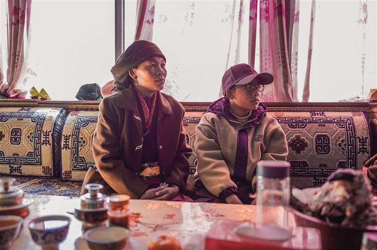 當日,天空晴朗,在廣袤無垠、無樹木遮擋的曠野上,稍起一陣疾風,便會揚起一層薄薄的黃沙。從村委會出發(fā),沿著冰湖畔的水泥小路前行,很快就來到了村民倫珠曲珍的家。一進屋,厚實的木門便將凜冽的寒風擋在了門外。“快請進,這幾天風沙有點大,普莫雍措都沒以前藍了?!眰愔榍湟贿呹P門一邊熱情地笑著說道。