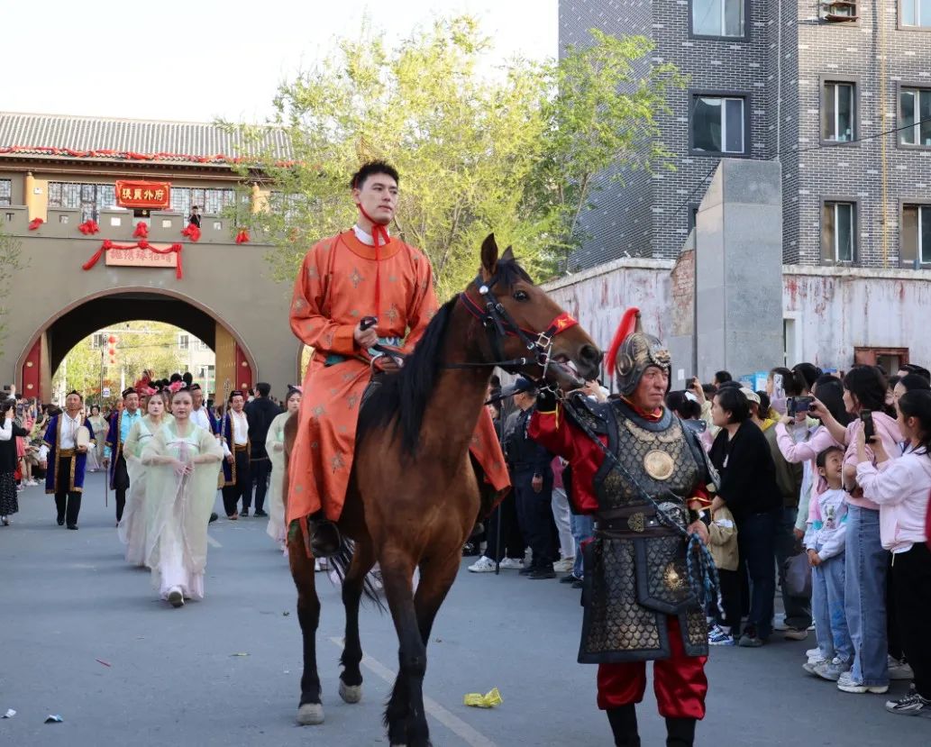 一隊身著鎧甲、手執(zhí)紅纓槍的威武“瀚海軍”兵士,步伐整齊、沿街巡邏,路上行人紛紛拿出手機拍照。這是在吉木薩爾縣街頭常見的北庭都護(hù)府將士“巡城護(hù)疆”的精彩場景。