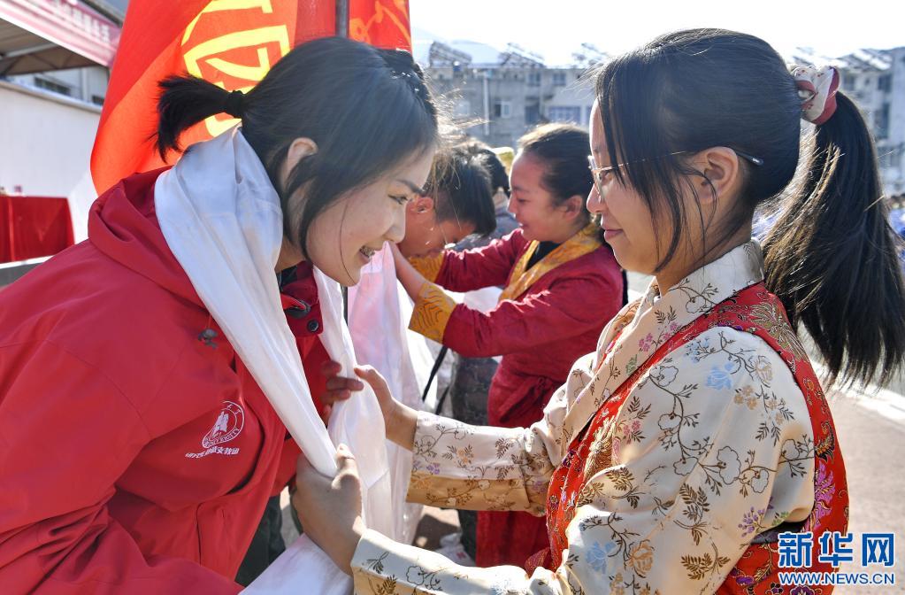 山南市東輝中學學生代表向湖北大學碩士研究生支教團成員獻哈達(3月29日攝)。新華社記者 張汝鋒 攝