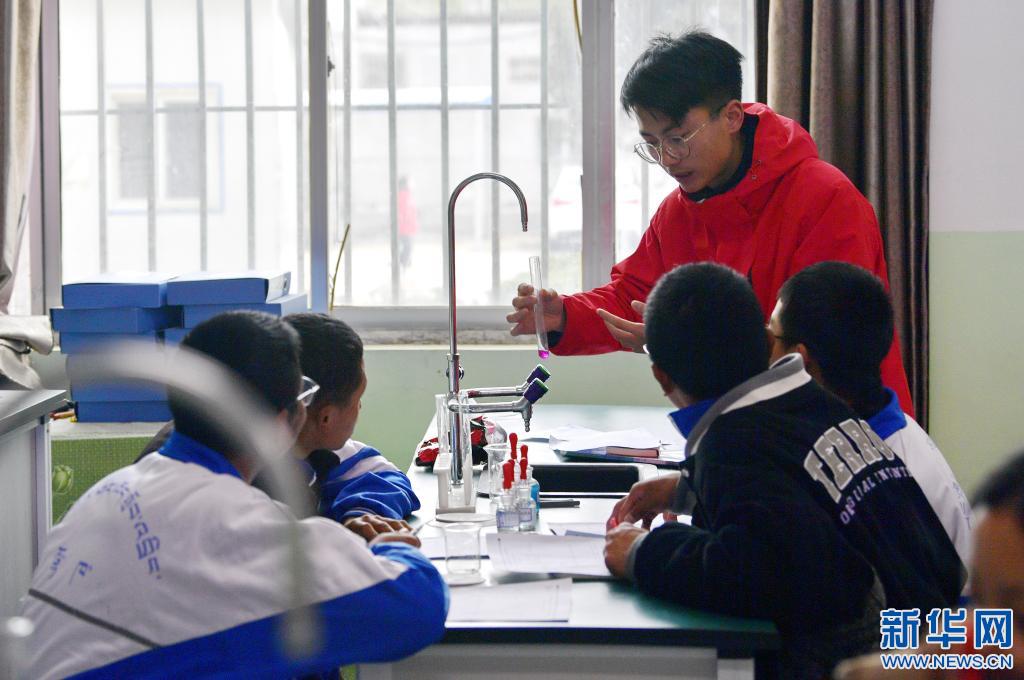 在山南市東輝中學實驗室,來自湖北大學化學化工學院的碩士研究生劉思江指導學生做化學實驗(3月29日攝)。新華社記者 張汝鋒 攝