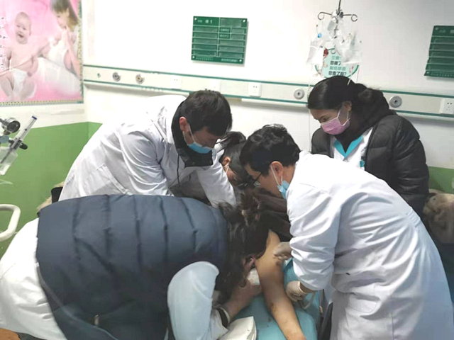 援藏醫(yī)療隊快速分工,組成新生兒復(fù)蘇團(tuán)隊。呼吸球囊尚未到位,孫豐濤毫不猶豫地為孩子實(shí)施口對口人工呼吸。徐鴻宇立即給予“雙拇指環(huán)繞法”胸外心臟按壓,縣醫(yī)院婦產(chǎn)科醫(yī)護(hù)人員積極協(xié)助。斷臍處理后,迅速將孩子移至暖臺保暖,繼續(xù)胸外心臟按壓、呼吸球囊面罩輔助呼吸。經(jīng)過分秒必爭的搶救,孩子心跳恢復(fù),全身皮膚轉(zhuǎn)紅潤,但呼吸和反應(yīng)仍然不好。經(jīng)過與家屬溝通,徐鴻宇給予氣管插管,繼續(xù)人工輔助通氣,并將孩子轉(zhuǎn)往上級醫(yī)院繼續(xù)治療。在此期間,產(chǎn)婦胎盤順利娩出,生命體征平穩(wěn)。