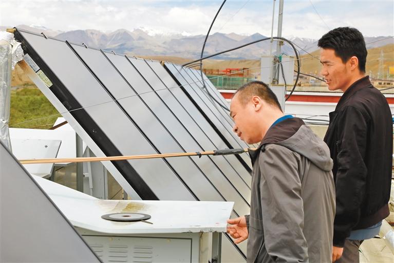 圖為香孜鄉(xiāng)干部在檢查太陽能供熱設(shè)備。記者 永青 扎西羅布 攝