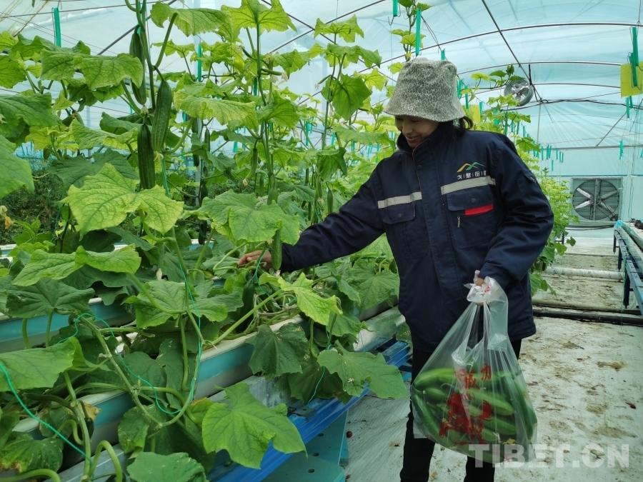 多吉曲西正在植物工廠(chǎng)里采摘成熟的黃瓜 攝影:鄒慧