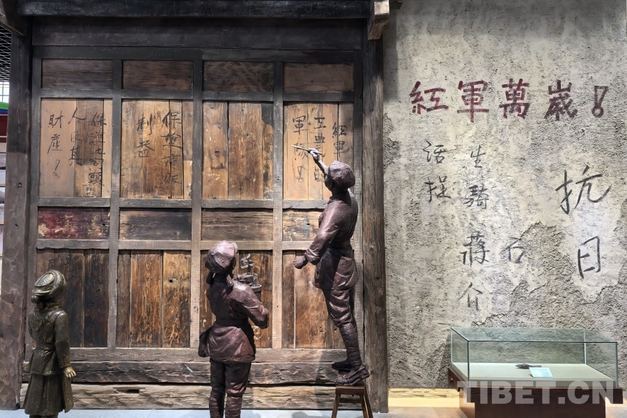 圖為迪慶紅軍長(zhǎng)征博物館外,賀龍等人贈(zèng)送“興盛番族”綢匾的情景還原 攝影:邊子捷