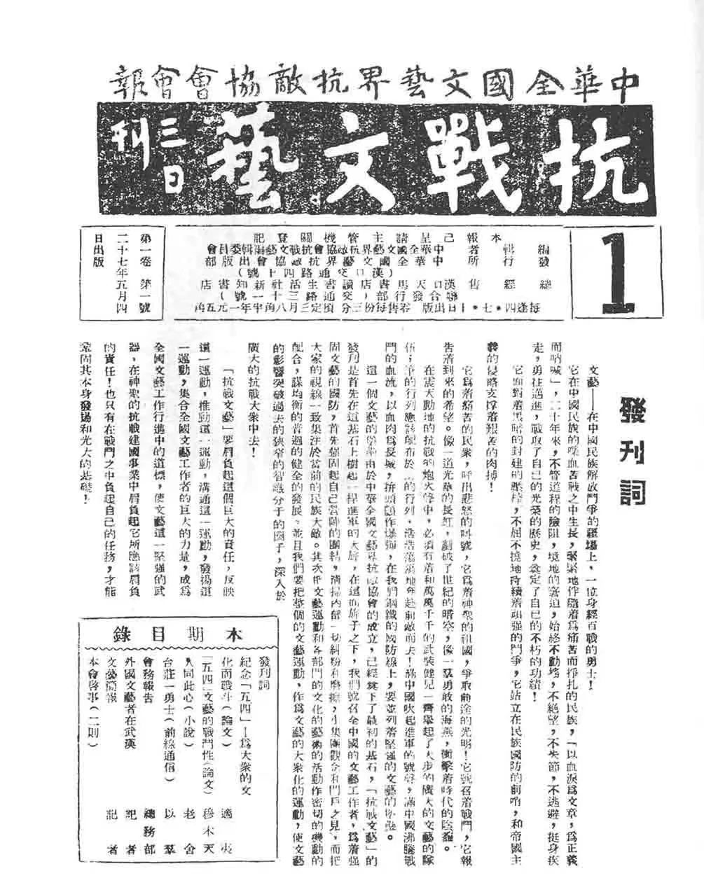 1938年3月,由老舍、郭沫若、郁達夫等作家及馮玉祥、邵力子等知名人士籌備的中華全國文藝界抗敵協(xié)會(簡稱“文協(xié)”),在武漢漢口總商會禮堂宣告成立,號召“我們應該把分散的各個戰(zhàn)友的力量,團結起來,像前線將士用他們的槍一樣,用我們的筆,來發(fā)動民眾,捍衛(wèi)祖國,粉碎寇敵,爭取勝利?!彪S后,其會刊《抗戰(zhàn)文藝》發(fā)刊,承載著愛國文藝工作者挽救中華民族、抗戰(zhàn)到底的決心,成為貫通整個抗戰(zhàn)時期的核心文藝陣地,匯聚文藝力量的精神堡壘。