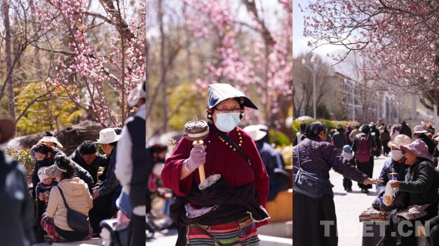 近日,位于布達拉宮腳下的宗角祿康公園里,桃花、櫻花、海棠花次第盛開,老人們?nèi)齼山Y(jié)伴漫步林間 攝影:德吉卓瑪