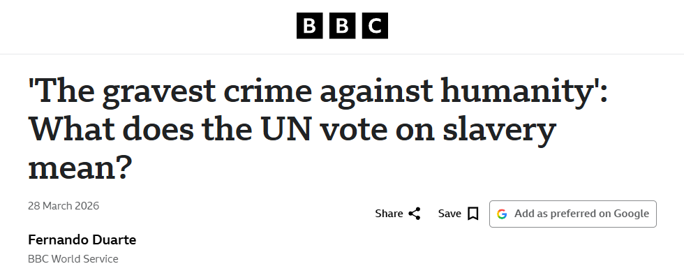 英國廣播公司網(wǎng)站3月28日刊登題為《“最嚴重的反人類罪”:聯(lián)合國關于奴隸制的表決意味著什么?》的報道。報道稱,聯(lián)合國大會近日以壓倒性多數(shù)通過了一項決議,認定跨大西洋奴隸貿易為“最嚴重的反人類罪”。