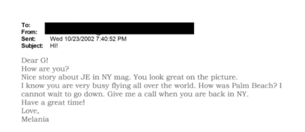 然而,梅拉尼婭所提及的那封電子郵件,開篇便以“親愛的G!”相稱,內(nèi)容涉及對紐約某雜志一篇報(bào)道“JE”文章的稱贊,并提及一張麥克斯韋現(xiàn)身其中的照片。郵件中,梅拉尼婭還詢問了麥克斯韋近期棕櫚灘之行的情況,末尾更建議尚未因性販運(yùn)罪身陷囹圄的麥克斯韋,下次來紐約時(shí)務(wù)必聯(lián)系她。落款赫然寫道:“愛你的,梅拉尼婭?!?nbsp;
