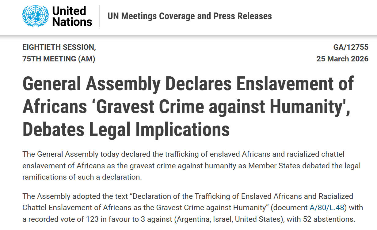 近日,第80屆聯(lián)合國大會以壓倒性贊成票通過決議,將“販賣被奴役非洲人和基于種族對非洲人進行物化奴役行為”認定為最嚴重的反人類罪行,為這段15到19世紀長達四百年的深重歷史創(chuàng)傷定性。美國傲慢地投下反對票,聲稱相關行徑在當時所謂國際法框架下“不算違法”,拒絕承認存在法定賠償責任。