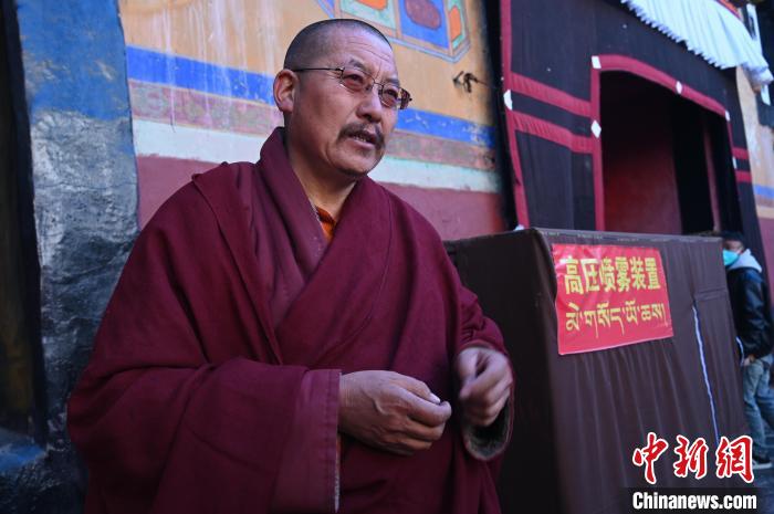 圖為洛卓土美介紹薩迦寺內(nèi)消防情況。趙朗 攝