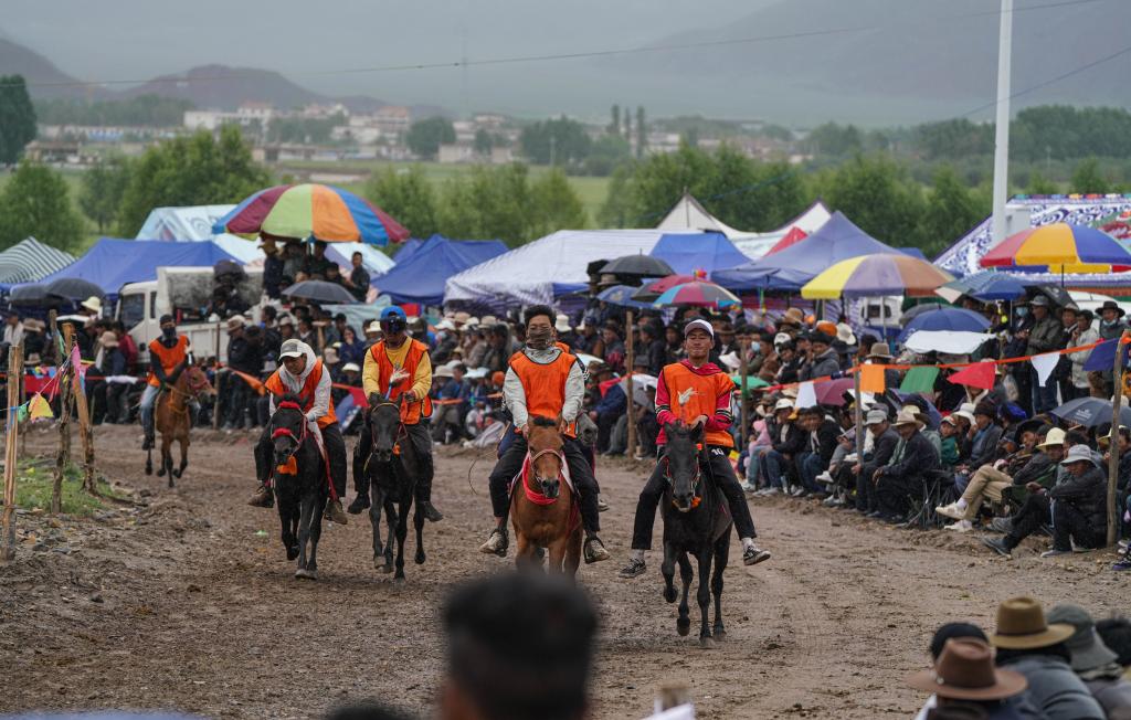 當(dāng)日比賽中,上百名選手根據(jù)參賽馬匹的年齡被分入不同的組別。邊瑪益丹在5歲及以上的“大馬”組比賽中奪冠。他和他的賽馬來自那曲市嘉黎縣,這是他第二次參加林周縣的賽馬比賽?!耙灿泻芏嗳说轿覀兡抢锶⒓淤愸R比賽,我們牧區(qū)之間常常有賽馬交流?!彼f。