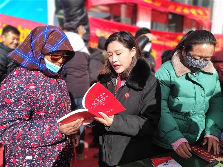 圖為安多縣“青藏線雪蓮護(hù)家隊(duì)”在帕那鎮(zhèn)第六小區(qū)向婦女群眾進(jìn)行普法宣傳。記者 姚海全 候朋飛 攝