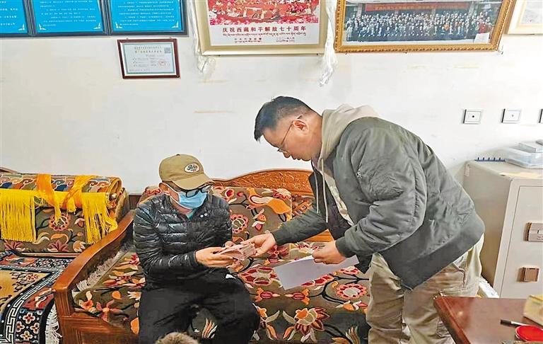 拉薩市沖賽康社區(qū)工作人員將幫扶慰問金送到困難黨員拉巴次仁手中。記者 央金 攝