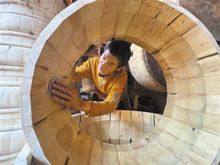 圖為羅布扎西在制作藏式皮鼓。記者 次仁平措 攝