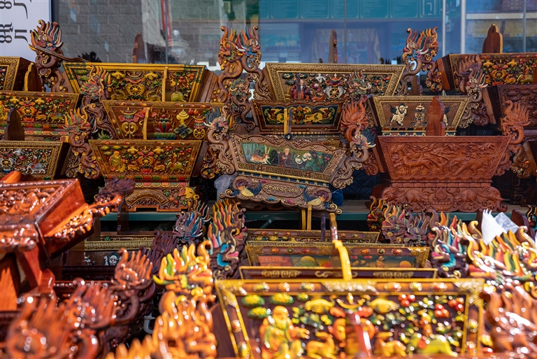 “老板,這個切瑪盒多少錢?便宜點(diǎn)我就拿走了?!薄斑@個圖案樣式都是精心雕刻的,最低1300元,實(shí)在不能再少了?!贝稳实牡赇伹?,不少顧客正在挑選“切瑪盒”,生意很是火爆?!扒鞋敽小笔菍⒕贫沸文竞杏酶舭宸珠_,左右兩邊分別盛入炒青稞和糌粑,再插上象征五谷豐登的“羅薩梅朵”和寓意吉祥的酥油花,寓意人壽年豐、吉祥如意,是藏歷新年家家戶戶必備的年貨之一。次仁告訴記者,“切瑪盒”根據(jù)圖案、顏料、大小、木材等因素,售價從幾百元到上千元不等,很多顧客普遍喜愛傳統(tǒng)樣式與圖案。