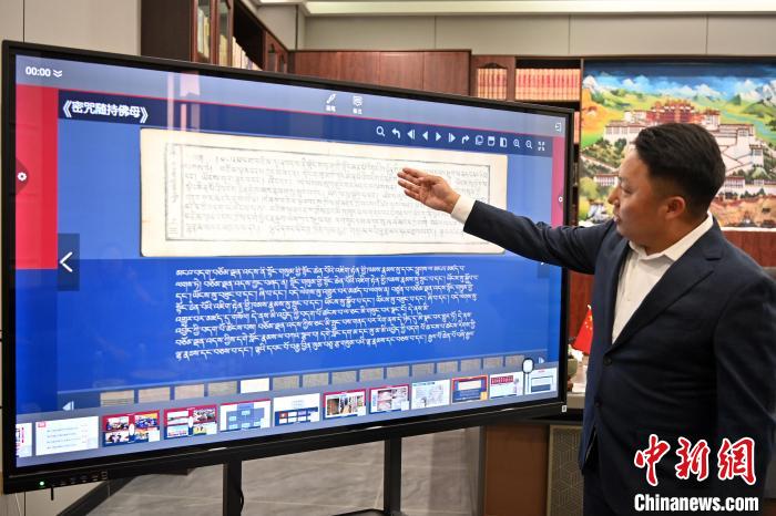 2月27日,在甘肅甘南藏族自治州碌曲縣益西達(dá)吉科技有限公司內(nèi),工作人員正在進(jìn)行藏文古籍?dāng)?shù)字化相關(guān)工作。該公司主要從事民族古籍?dāng)?shù)字化建設(shè)和古籍文獻(xiàn)數(shù)據(jù)庫建設(shè),自2019年以來,承擔(dān)西藏、四川、甘肅等省區(qū)的藏文古籍?dāng)?shù)字化項(xiàng)目。圖為工作人員介紹藏文古籍?dāng)?shù)字化相關(guān)工作。中新社記者 九美旦增 攝