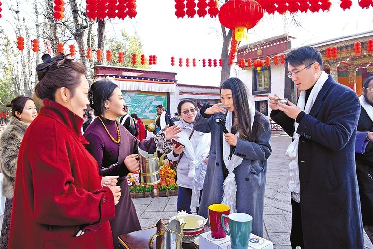 隨著一聲聲“扎西德勒!”“新年快樂!”的祝福語響起,身著盛裝的工作人員站在切瑪盒旁邊,熱情地教游客吃“切瑪”。“切瑪”盒里滿滿的青稞粒和糌粑,再加上金燦燦的酥油花和染成紅綠兩色的“羅薩梅朵”麥穗的裝點(diǎn),象征著五谷豐登、福澤綿長。來自廣東的游客張女士一家是專程趕來過藏歷新年的,想來體驗不同年味兒的她輕捏一撮切瑪撒向空中:“愿我們?nèi)医】灯桨?,也祝祖國繁榮昌盛!”