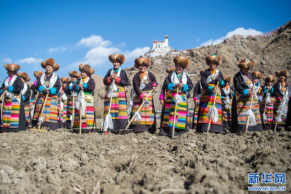 16日,西藏山南市乃東區(qū)門中崗社區(qū)的群眾按照傳統(tǒng)儀式,身著盛裝,手捧青稞酒,在雍布拉康宮殿腳下的西藏“第一塊農(nóng)田”舉行春耕儀式,播撒今春第一粒種子。