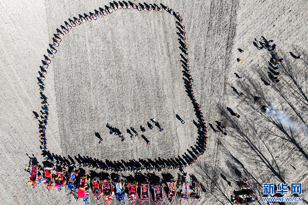 圖為西藏山南市乃東區(qū)門中崗社區(qū)春耕儀式現(xiàn)場(chǎng)(3月16日攝,無人機(jī)照片)。新華網(wǎng) 旦增努布 攝