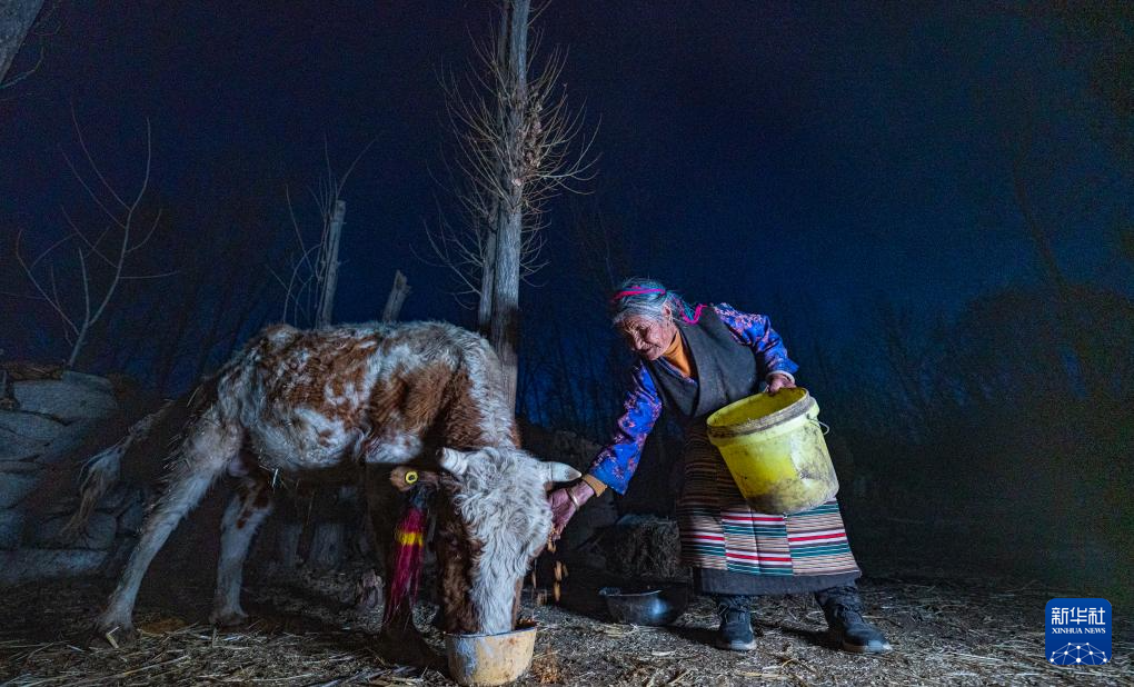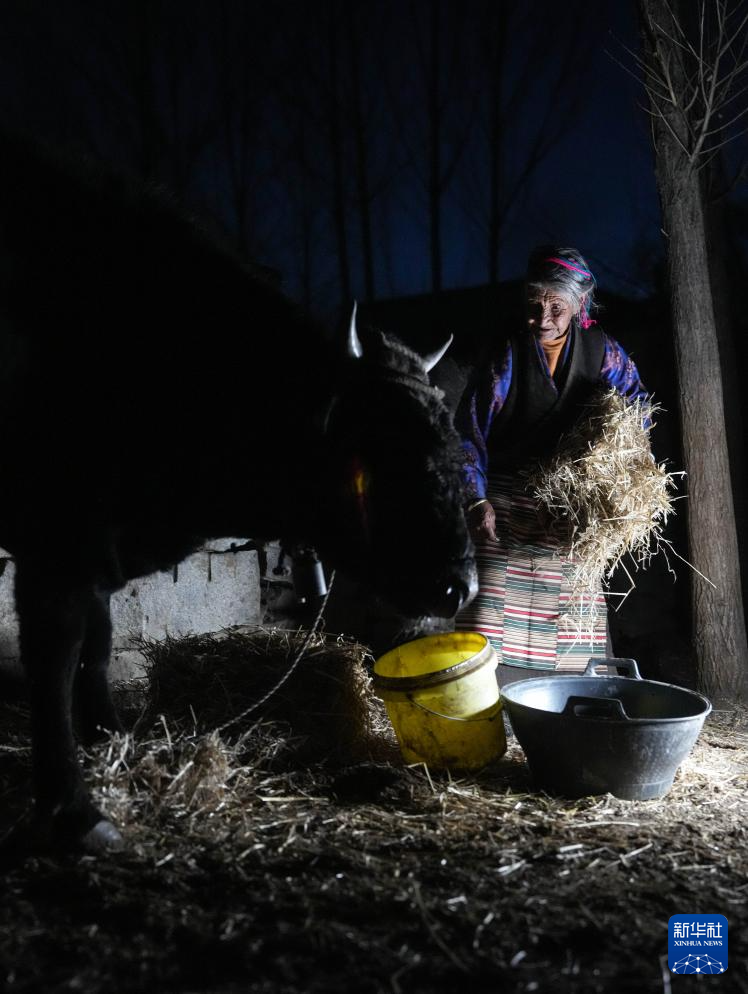 3月12日,格桑美多老人在家給牛喂草。新華社記者 晉美多吉 攝