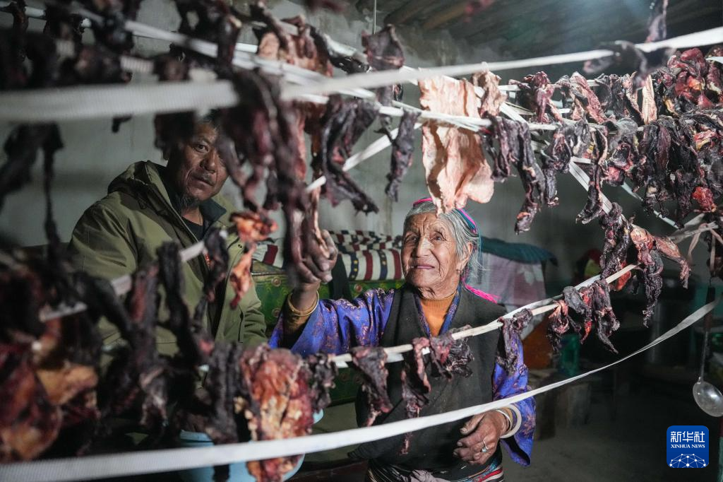 3月12日,格桑美多老人(右)拾取家里曬的風干牛肉。新華社記者 晉美多吉 攝