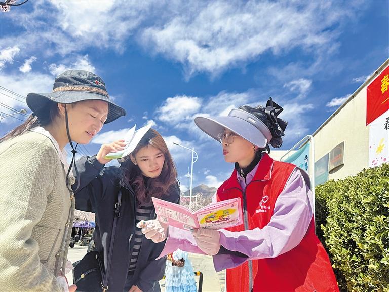 圖為志愿者正在為過往行人發(fā)放精心制作的家庭安全用電宣傳手冊(cè)。記者 拉巴桑姆 攝
