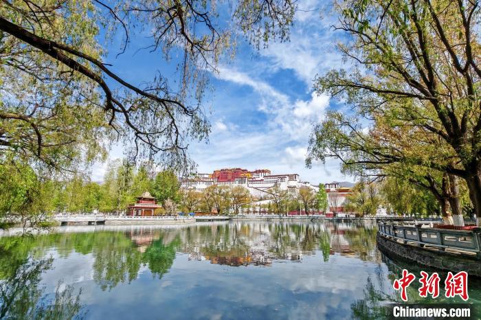 4月,高原古城拉薩一派春景,布達拉宮前后潭水凝碧、柳樹搖青,游客絡繹不絕。