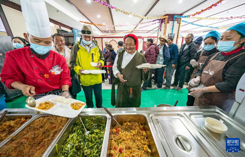 4月25日,在那曲市色尼區(qū)老年人日間照料中心,老人們在排隊打飯。新華社記者 丁增尼達 攝