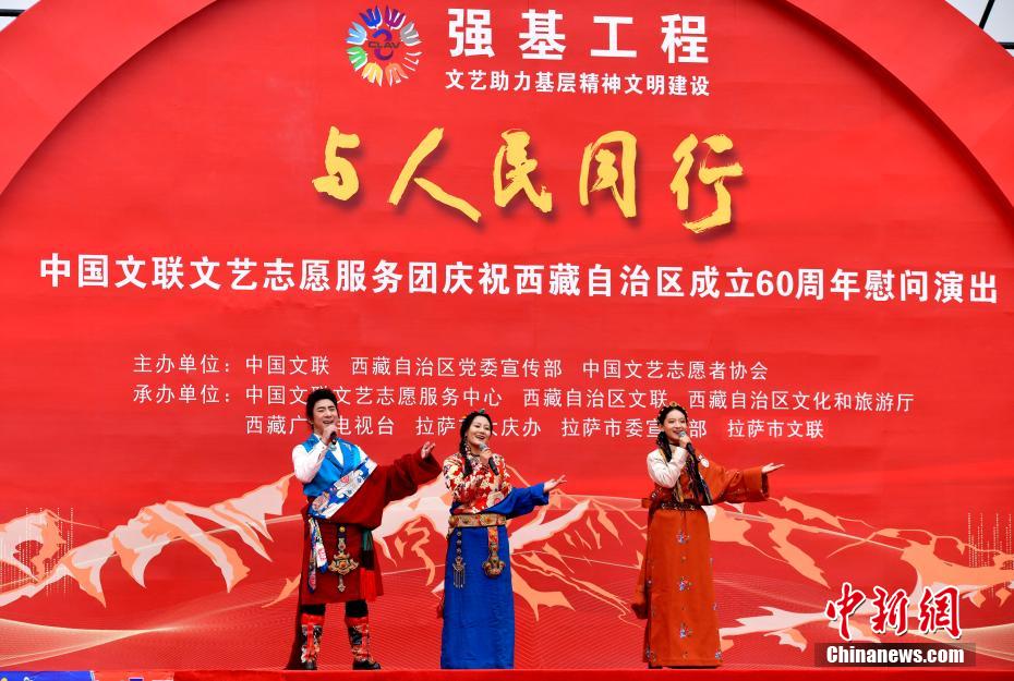 5月25日,由中國(guó)文聯(lián)、西藏自治區(qū)黨委宣傳部、中國(guó)文藝志愿者協(xié)會(huì)主辦的“與人民同行”中國(guó)文聯(lián)文藝志愿服務(wù)團(tuán)慶祝西藏自治區(qū)成立60周年慰問(wèn)演出在位于拉薩的西藏會(huì)展中心廣場(chǎng)舉行。藝術(shù)家們?yōu)楝F(xiàn)場(chǎng)觀(guān)眾帶來(lái)歌曲、舞蹈、相聲、朗誦等節(jié)目,把優(yōu)質(zhì)文化服務(wù)送到基層一線(xiàn)。圖為歌曲《珠穆朗瑪》演出現(xiàn)場(chǎng)。