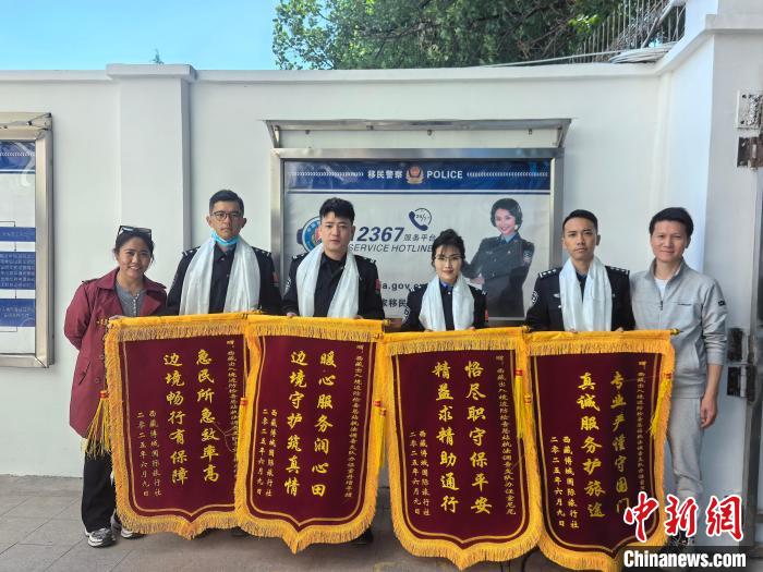圖為西藏邊檢總站執(zhí)法調(diào)查支隊辦證室民警與贈送錦旗人員合影。徐錫萬 攝