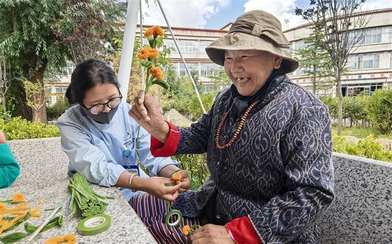 近日,記者走進(jìn)拉薩市社會福利院的大門,一陣歡快的笑聲便撲面而來。循聲望去,涼亭下,幾位老人正圍坐在一起,手中拿著彩色毛線,在編織老師的耐心指導(dǎo)下專注地編織著花朵?!翱?,我的花做好了!”卓嘎老人高高舉起剛剛完成的一朵黃色小花,孩子般興奮地向同伴們展示。她的手指雖有些顫抖,但眼神中卻掩飾不住自豪。另外一邊,幾位老人正在院子里悠閑地散步,一位護(hù)工正小心翼翼地攙扶著行動不便的老人,輕聲問道:“今天腿還疼嗎?要不要去理療室做做按摩?”關(guān)切之情溢于言表。