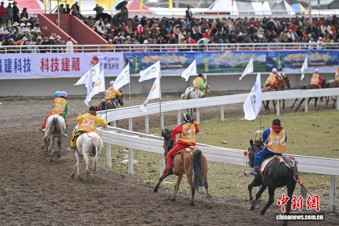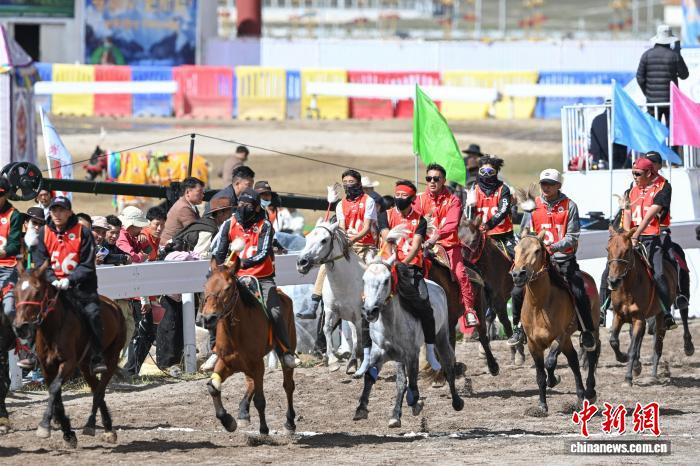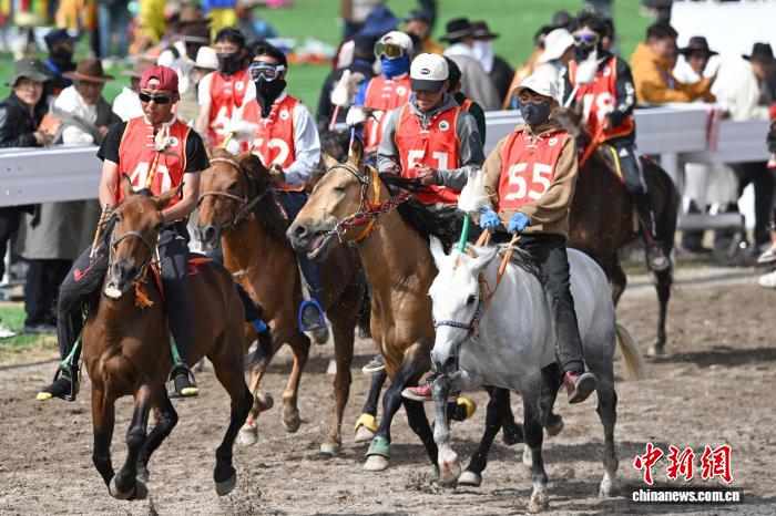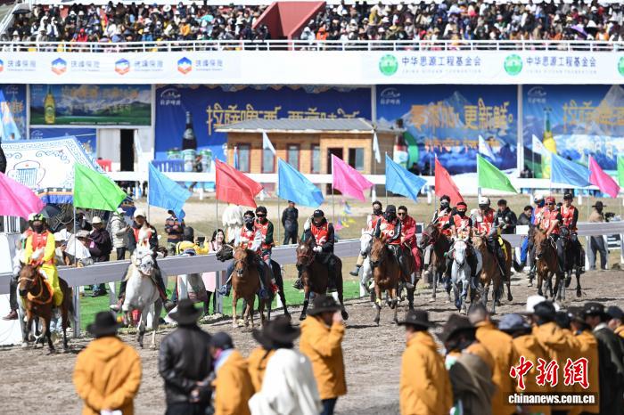 9月6日,西藏自治區(qū)那曲市恰青賽馬節(jié)進入第二天,格薩爾賽馬場賽事精彩不斷。場內,1.38米以下小馬展開10000米速跑、10000米走馬、12000米走馬決賽,1.38米以上1.45米以下大馬角逐10000米速跑決賽。為觀眾帶來速度與耐力的草原盛宴,盡顯藏北草原賽馬文化的獨特魅力。圖為1.38米以上1.45米以下大馬速度賽比賽現(xiàn)場。中新社記者 貢嘎來松 攝