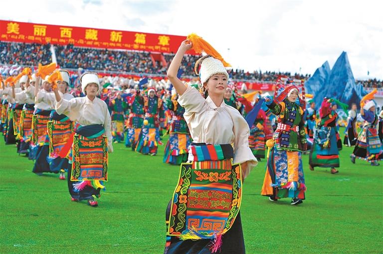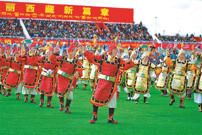 來自四川、青海及西藏本地的馬術(shù)隊英姿颯爽,躍馬揚鞭;千人共舞《禮贊甲子》,舞步豪邁,衣袂飛揚,再現(xiàn)西藏六十年的滄桑巨變;器樂合奏《風從浙江來·樂在那曲揚》則巧妙融合江南韻律與草原風情,奏響對口支援的深情厚誼;《馱鹽之歌》悠揚響起,仿佛將人們帶回了古老的歲月,展現(xiàn)了高原兒女堅韌不拔的精神……賽馬場核心區(qū)域,傳統(tǒng)馬術(shù)與現(xiàn)代藝術(shù)在這里交相輝映,引來掌聲如潮、喝彩不絕。